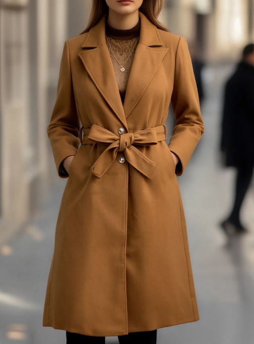 The Classic Camel Wool Trench Coat with Belted Silhouette provides a structured, comfortable fit suitable for daily wear and cooler weather. It offers easy layering, clean lines, and a polished look for casual or semi-formal use.