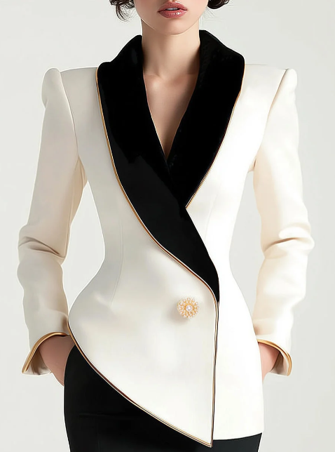 Elegant Asymmetrical White Blazer with Black Contrast Lapels