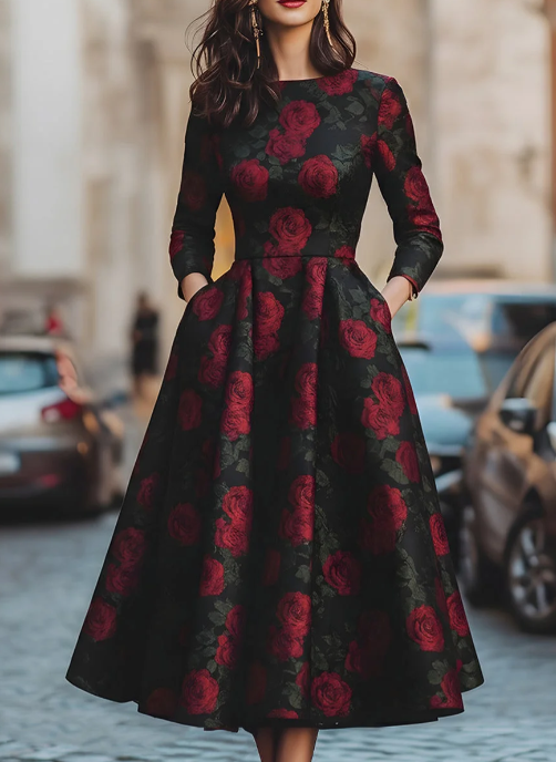 Elegant Jacquard Rose Print Midi Dress