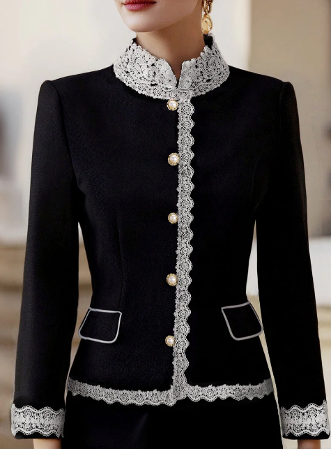 The Elegant Pearl Button Blazer With Contrast Lace Trim offers a balanced, structured fit suitable for everyday wear and semi-formal settings. It keeps a clean look, allows easy movement, and works well when you want a polished but relaxed outfit.