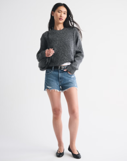 High rise with a relaxed fit throughout the hip and thigh, and a 2.5 inch (6.25 cm) inseam. Vintage stretch denim in a medium wash, with distressed details and raw-cut hem. Imported.