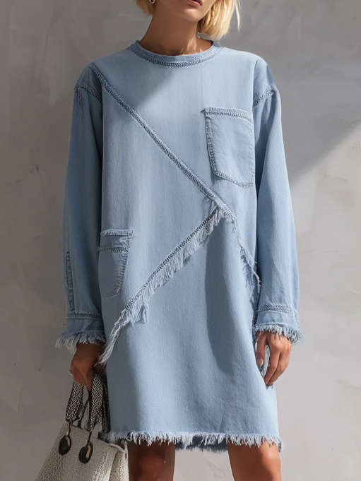 The Light Blue Raw-Edge Denim Mini Dress offers a structured yet comfortable fit designed for everyday wear. It keeps a clean denim silhouette and works well for casual outings or relaxed social settings.