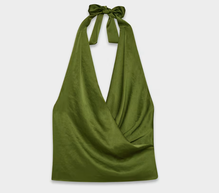 This is a sleeveless cowlneck halter top that ties around the neck. It’s cut from drapey Japanese satin with a soft sheen and vintage finish for a crinkled look and feel.