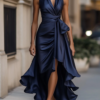 The Midnight Blue Draped Satin Maxi Dress With Ruffle Details offers a balanced fit suited for casual and semi-formal outings. It maintains a clean silhouette, allows natural movement, and works well when you want a simple, polished look.